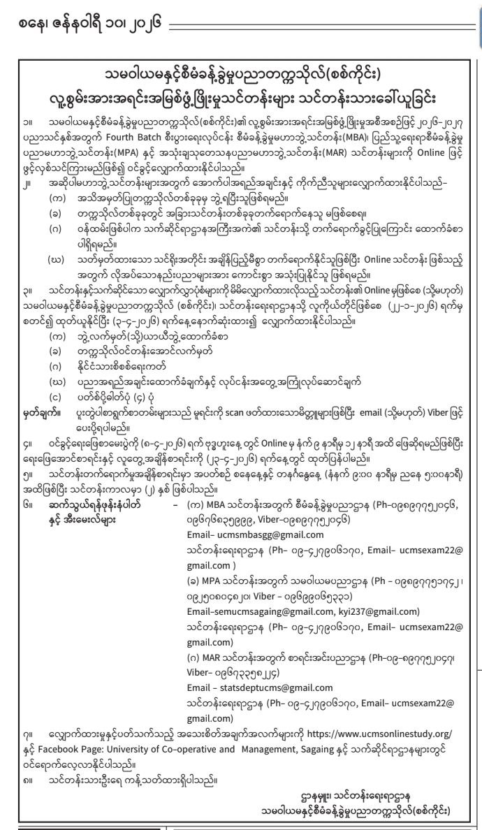 MPA, MBA ,MAR Application form များကို UCMS ၏ LMS website http://studyonline.ucms.edu.mm/ တွင် Download ရယူနိုင်ပါကြောင်း အသိပေးကြေညာအပ်ပါသည်။